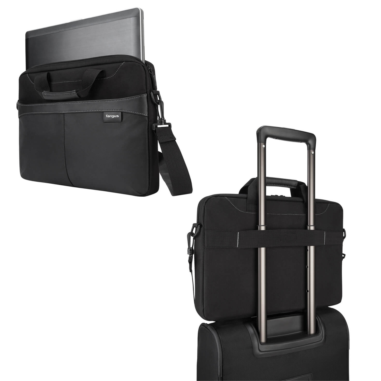 Maletín con acceso de carga superior, compartimento acolchado para computadora portátil de 15,6". Incluye una correa extraíble para el hombro, manijas de agarre suave, correa, un compartimento acolchado y bolsillo frontal con cremallera.