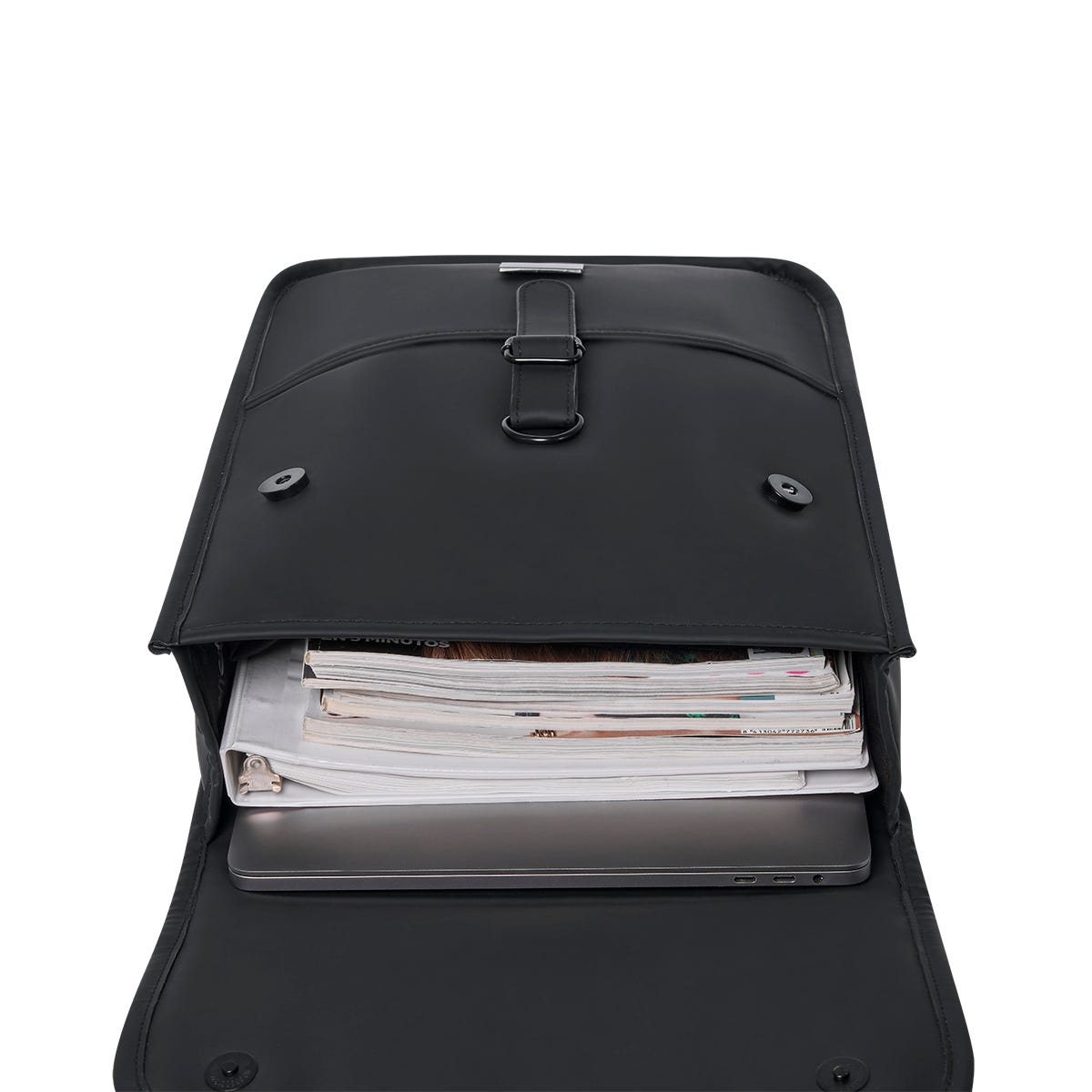 Bolsa principal con cerrado de broches magnéticos y gancho con correa ajustable. Compartimento interior acolchado para laptop de 14". Cierre invisible para acceder o remover fácilmente placa metálica. Tirantes ajustables.
