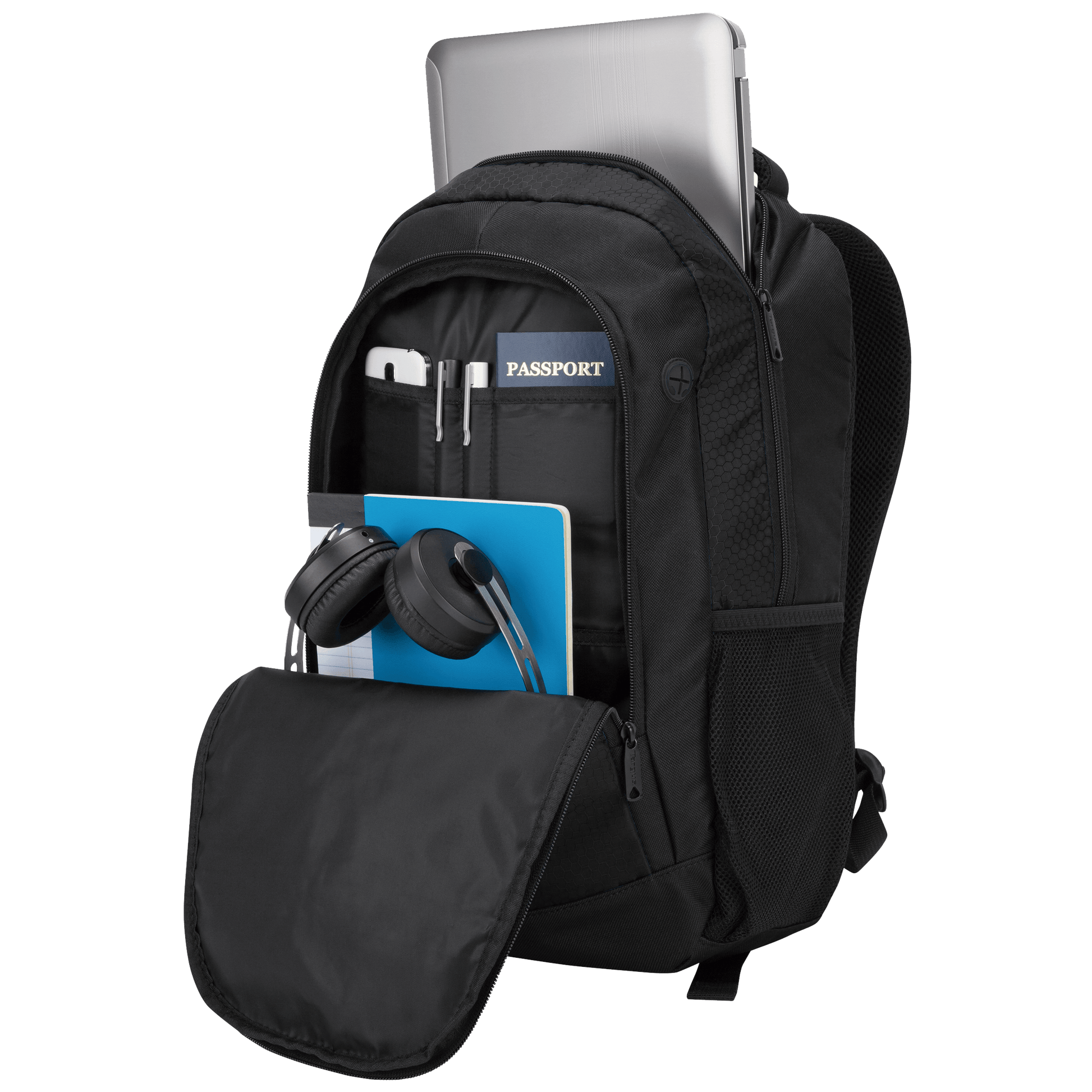 Mochila con 3 compartimentos: 1 compartimento principal con porta laptop 15.6" acolchada, 2 frontales con cierres, 2 laterales con malla, correas de hombro ajustables y asa superior.