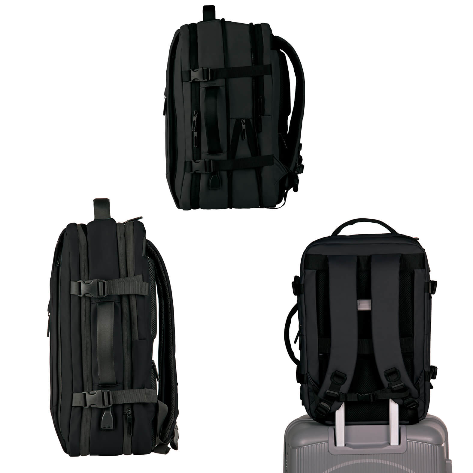 Mochila con compartimento principal de malla con cierre, puerto USB, organizador interno, cierre extensible para ampliar la capacidad, con broches ajustables, compartimento trasero con porta laptop de 17", tres bolsas frontales con cierre, respaldo acolchado con bolsa de seguridad y banda elástica, además de asa superior y lateral.