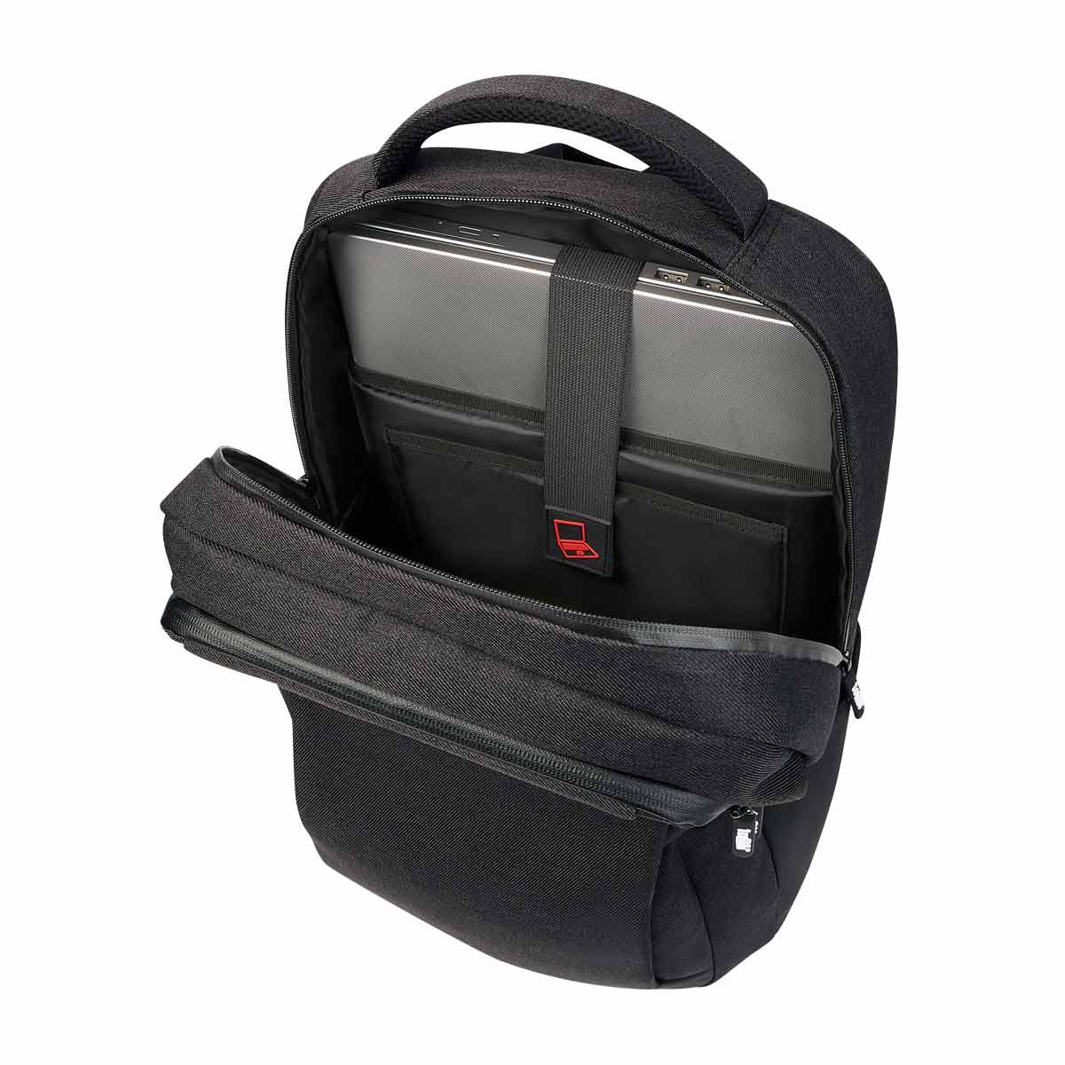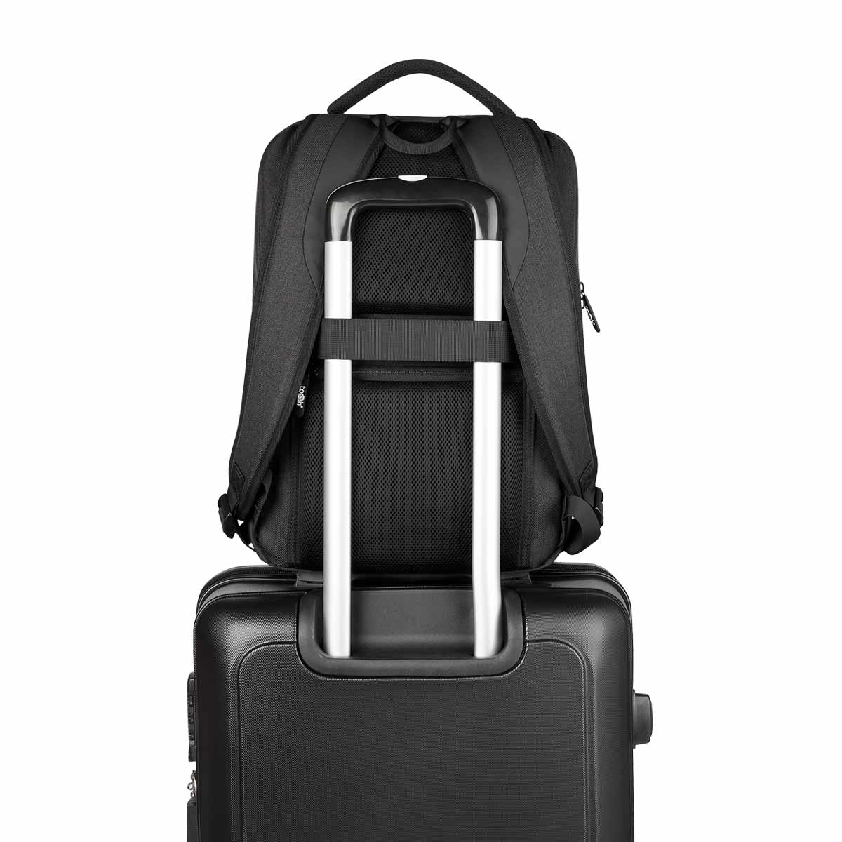 Bolsa principal con espacio para laptop de 14" y tablet. Compartimento con organizador. Bolsa frontal con cierre. 2 Bolsas laterales. Aditamento especial trasero para poner en trolley. Compartimento con cierre oculto en la parte posterior. Respaldo y tirantes acojinados.