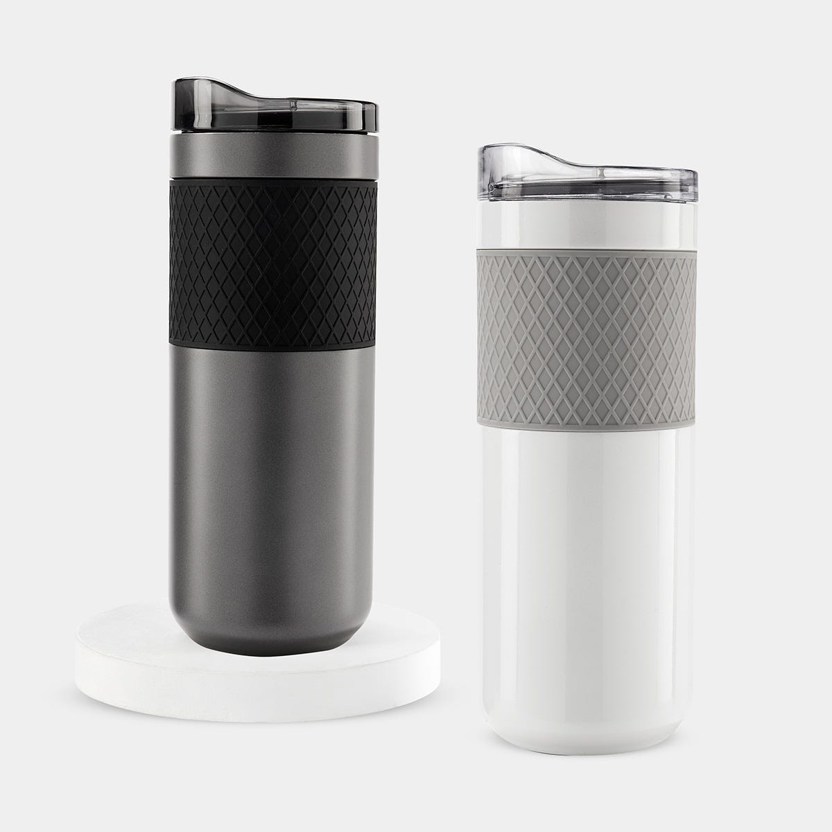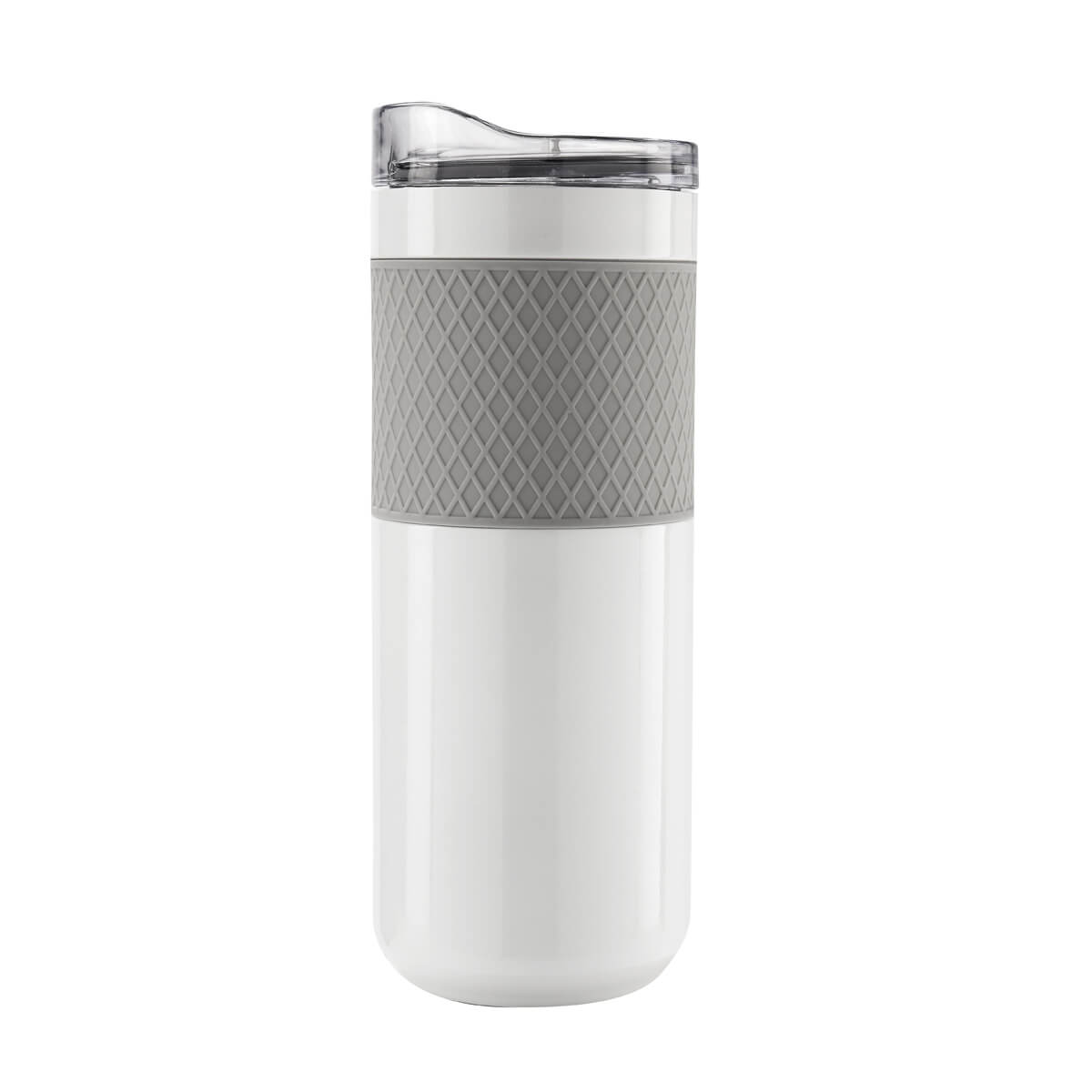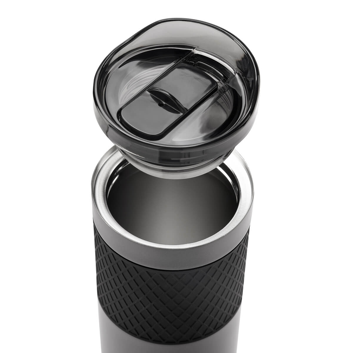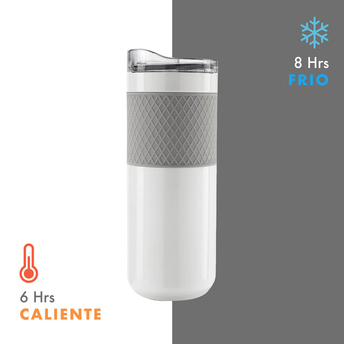 Termo de doble pared. Cerrado al vacío. Con Pared interna y externa de acero inoxidable. Incluye tapa de plástico con cierre de rosca y válvula de seguridad. Banda de silicón texturizada antiderrapante. Mantiene temperatura caliente 6 hrs y temperatura fría 8 hrs. Incluye caja individual.