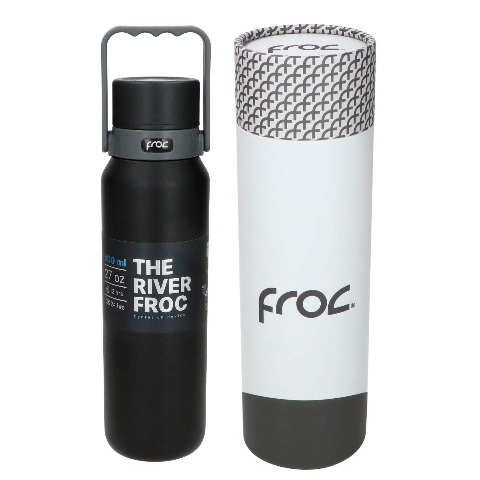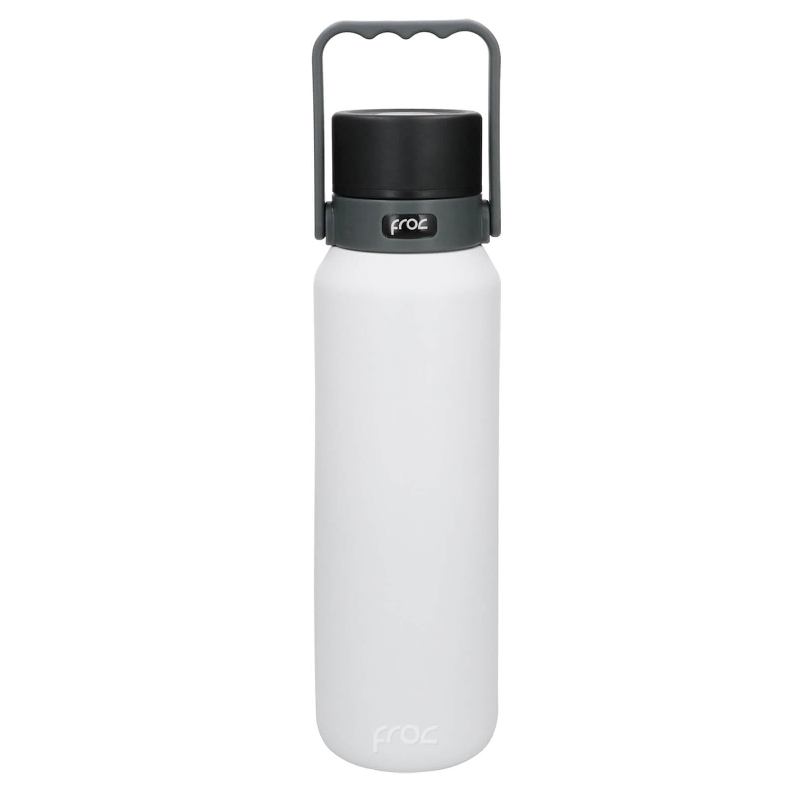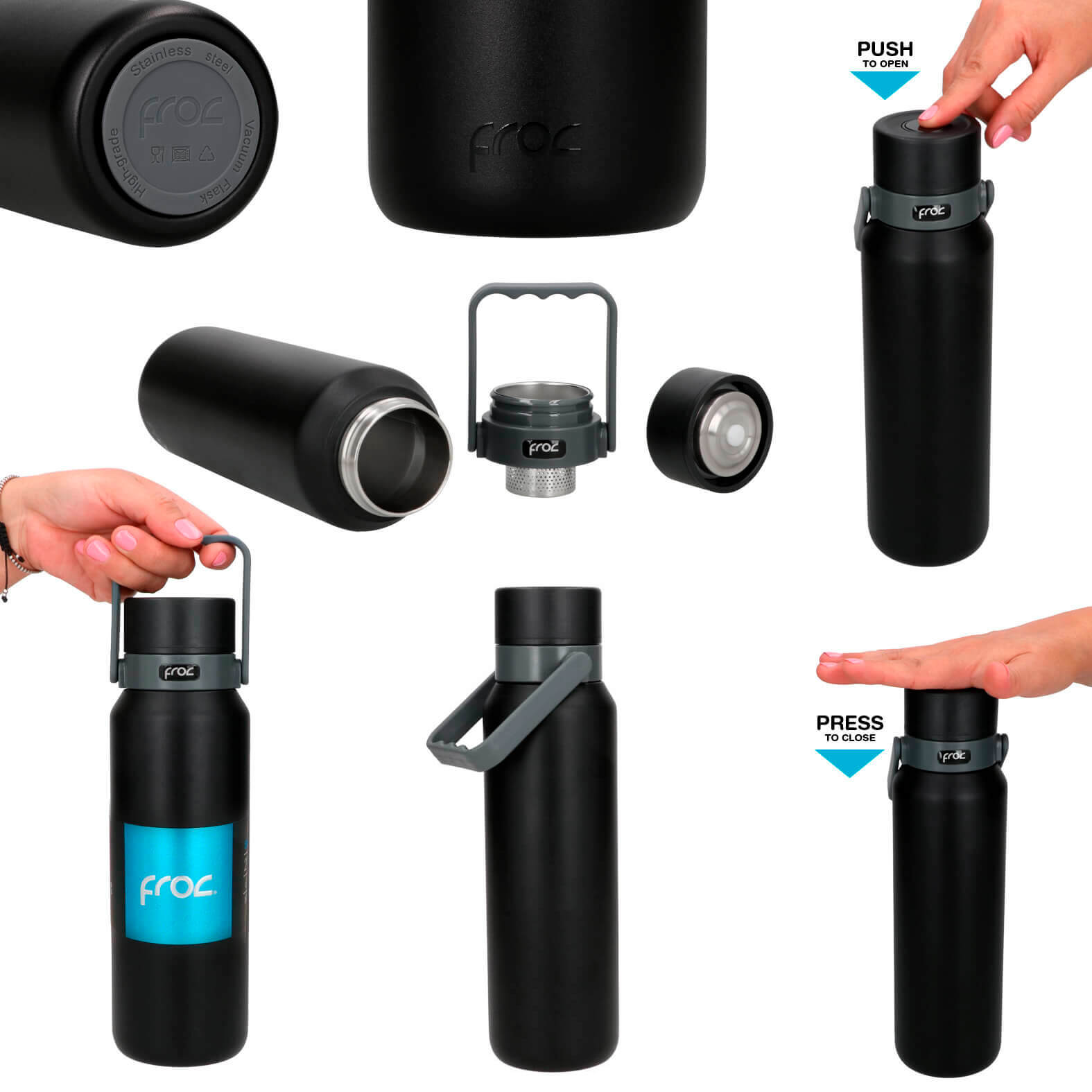 Termo con doble pared de acero inoxidable insulado al vacio, base antiderrapante, tapa hermética con coladera metálica y mecanismo de apertura y cerrado facil.